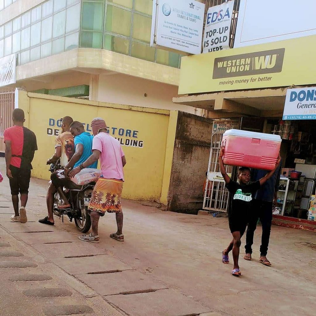 Am Dienstagvormittag bin ich erst einmal mit Musa und Margret ins Stadtzentrum gefahren, um Passfotos zu machen für meine Aufenthaltserlaubnis. Ich kenne das Prozedere schon aus Südafrika. Es gibt an einer Stelle in der Stadt die Passfoto-Fotografen. Wenn man die gefunden hat, wird man vor einer weißen Wand oder einem weißen Tuch platziert, das Foto wird gemacht und direkt ausgedruckt. Hier die Luxusvariante, sogar mit Schattenspendendem-Sonnen-/Regenschirm-Halter. Wenn ich gewusst hätte, dass an dem Tag ein Fototermin ansteht, hätte ich mich natürlich etwas mehr gestylt… Von dort ging es weiter zu zwei Internet-/ Telefonanbietern und dann habe ich noch kurz im Postoffice reingeschaut. Wie in einigen anderen Ländern, die ich kenne und die keine bekannten Reiseziele sind, gibt es nur im Postoffice Postkarten. In diesem Fall gibt es ganze drei Motive. Es handelt sich offensichtlich um Restbestände aus den 1980er Jahren. Ich versuche, die Restbestände in den kommenden Monaten aufzubrauchen, vielleicht gibt es dann bald auch aktuellere Postkartenmotive aus Sierra Leone. Und ich habe mir „Kaffee“ und Milchpulver besorgt, damit ich im Büro mit Heißgetränken versorgt bin.
