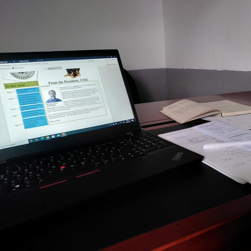 Das ist insbesondere ärgerlich, als dass ich gehofft hatte, nun geht es endlich los mit der Arbeit und voller Elan war. Abdul und Mariama habe ich mit E-Mails versorgt, in denen ich ihnen meine Kommentare und Ideen geschickt habe und warte nun ab ob, wie und wann wir darüber sprechen, um zu klären, wie wir weiterarbeiten. Die beiden sind bestimmt jetzt schon genervt von der übermotivierten Deutschen. Am Wochenende wäre eigentlich ein Waldspaziergang mit Bird-Watching angestanden. Der President des Vorstandes von CSSL hatte mich eingeladen. Freitag hätte ich meinen Termin beim deutschen Botschafter gehabt, nächsten Montag bei einer Partnerorganisation und am Donnerstag wäre ich eigentlich übers Wochenende zu unserem Büro in Kenema mit anschließendem Trip in den Gola Rainforest gefahren. Naja “small, small”. Dann wird das alles eben nach hinten verschoben, in der Hoffnung, dass die Regenzeit nicht zu früh einsetzt und Reisen weiterhin möglich sind.