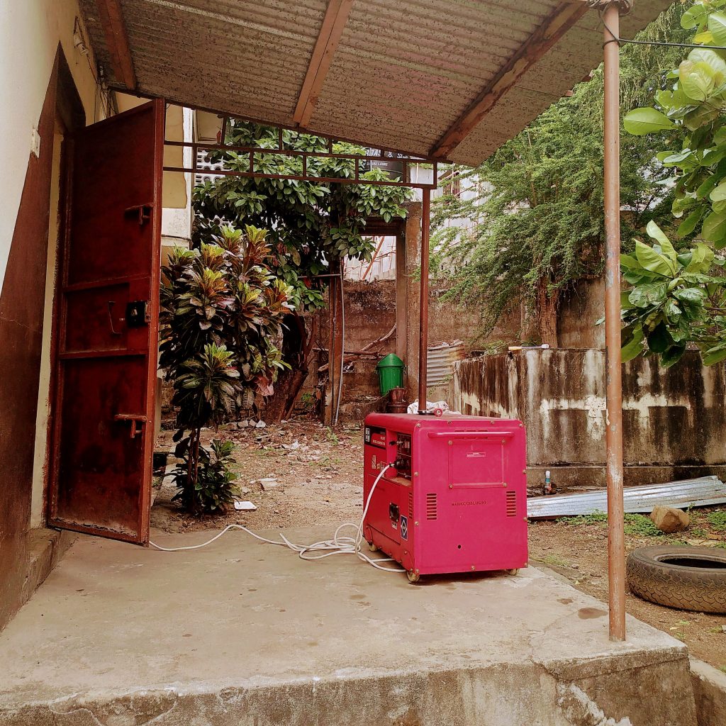 Und dann ging es endlich ins Büro. Ich war etwas aufgeregt, wie das so werden wird. Ist ja immer etwas spannend, wenn man einen neuen Job anfängt. Mein Fahrer Musa hat mich pünktlichst beim Hotel abgeholt, so dass ich um neun in der Arbeit war. Musa seht ihr unten auf dem Foto bei den Autos stehen. Links ist dann das Bürogebäude. Rechts seht ihr noch ein niedriges Gebäude angedeutet, da verbringen unsere Fahrer die Zeit, wenn sie gerade niemanden herumfahren. Die anderen Fotos zeigen die Einfahrt, unser Gebäude, unseren Eingang inklusive Generator (mein Bürofenster ist links neben dem Strauch, den ihr im Hintergrund seht) und ein paar Eindrücke aus meinem Büro inklusive Mittagessen (Reis mit Casavaleaf). Das letzte Bild zeigt einen Stromregulator. Den braucht man für einige elektronische Geräte, da es ziemlich starke Spannungsschwankungen gibt. Manche Geräte vertragen das nicht. Die normalen Bürozeiten hier sind 9-17 Uhr. Wie lange offiziell Mittagspause ist, habe ich noch nicht mitbekommen. Ich mache das nach Gefühl.