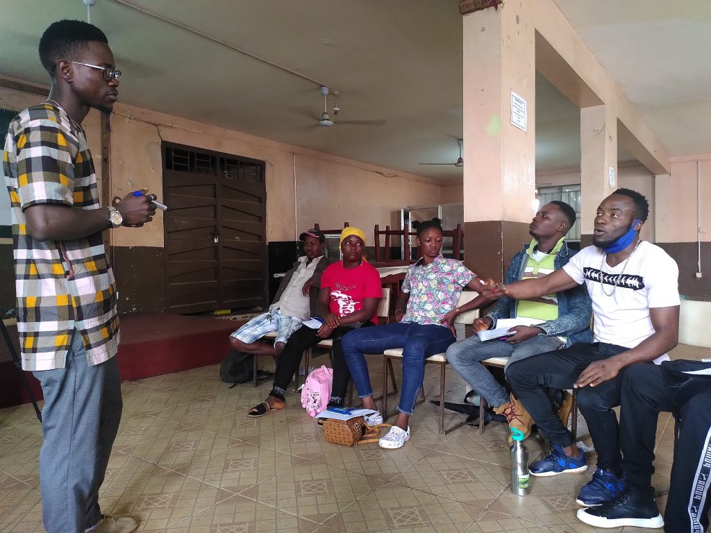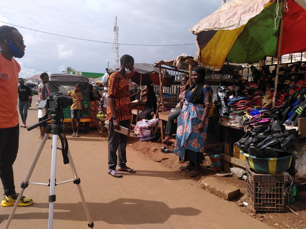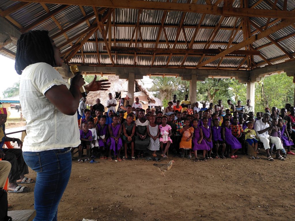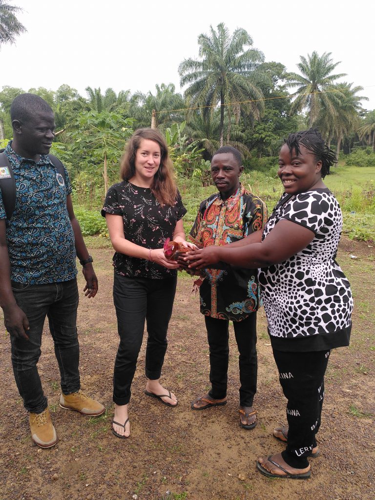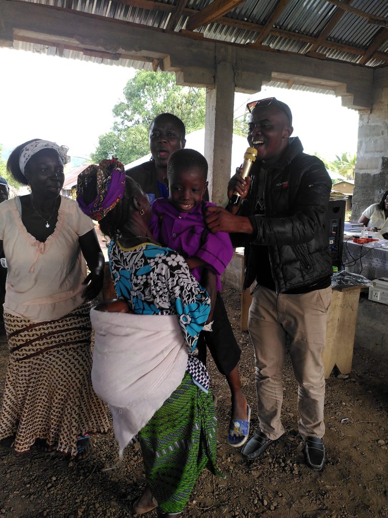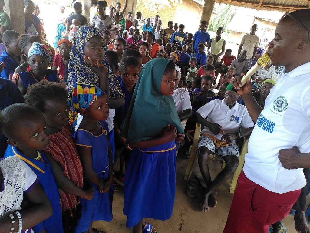 Auch ich hatte eine feste Rolle in unserem Programm. Ich habe immer ein bisschen vom globalen Klimawandel berichtet. Hier in Sierra Leone kam der Regen viel zu spät dieses Jahr und vor allem bis jetzt auch zu wenig. In Deutschland hingegen gab es zu viel Regen mit Flut und Todesopfern. Die Menschen fanden es sehr spannend etwas aus Deutschland zu erfahren. Vor allem hätten sie nicht gedacht, dass auch wir Probleme mit dem Klimawandel haben. Nach meiner kleinen Ansprache, gab es meist noch Zeit für Fragen. Die Leute waren sehr interessiert daran, wie bei uns der Wald aussieht, welche Tiere wir haben und ob man im Wald jagen darf. Es ist gar nicht so leicht, diese Fragen so zu beantworten, dass die Antworten verstanden werden, wenn die Menschen nur ihre eigene Umgebung kennen und keine Idee davon haben, wie in Deutschland Bäume, Tiere und Nutzpflanzen aussehen. Die Leute waren auch immer sehr überrascht, wenn ich gesagt habe, bei uns wachsen weder Bananen noch Mangos noch Papaya noch Ananas. Wahrscheinlich bemitleiden sie uns jetzt sehr.