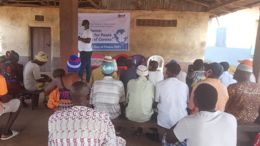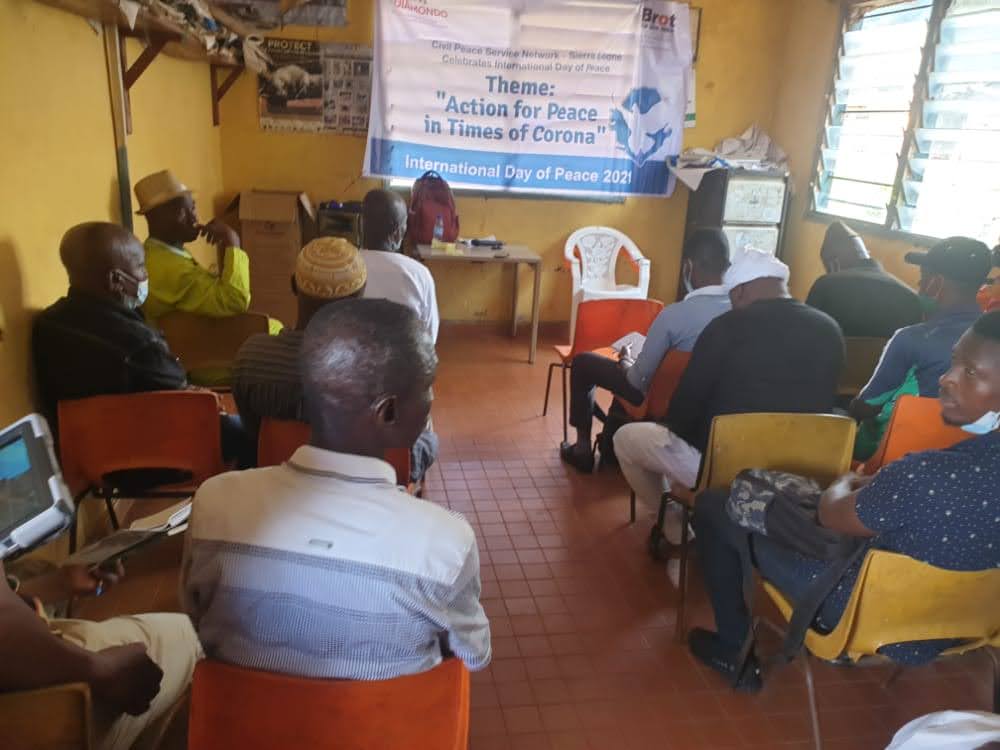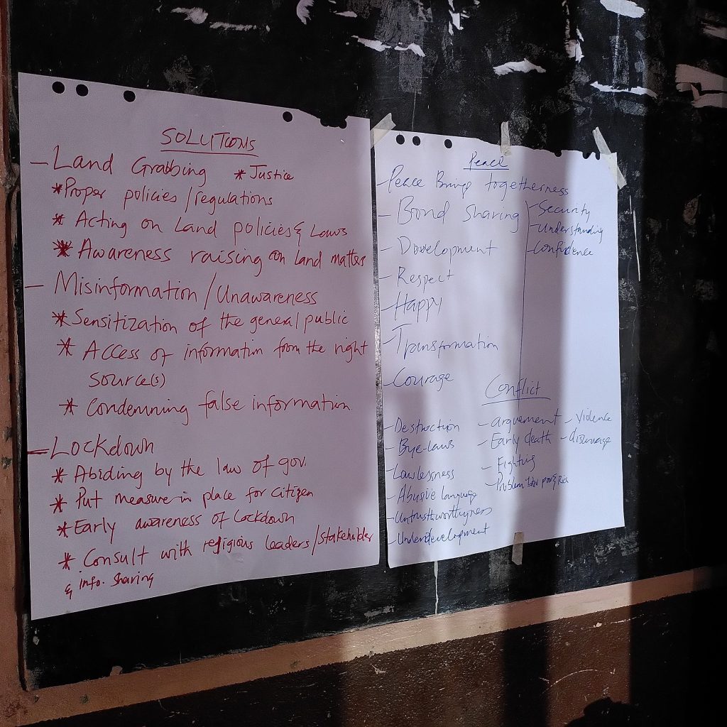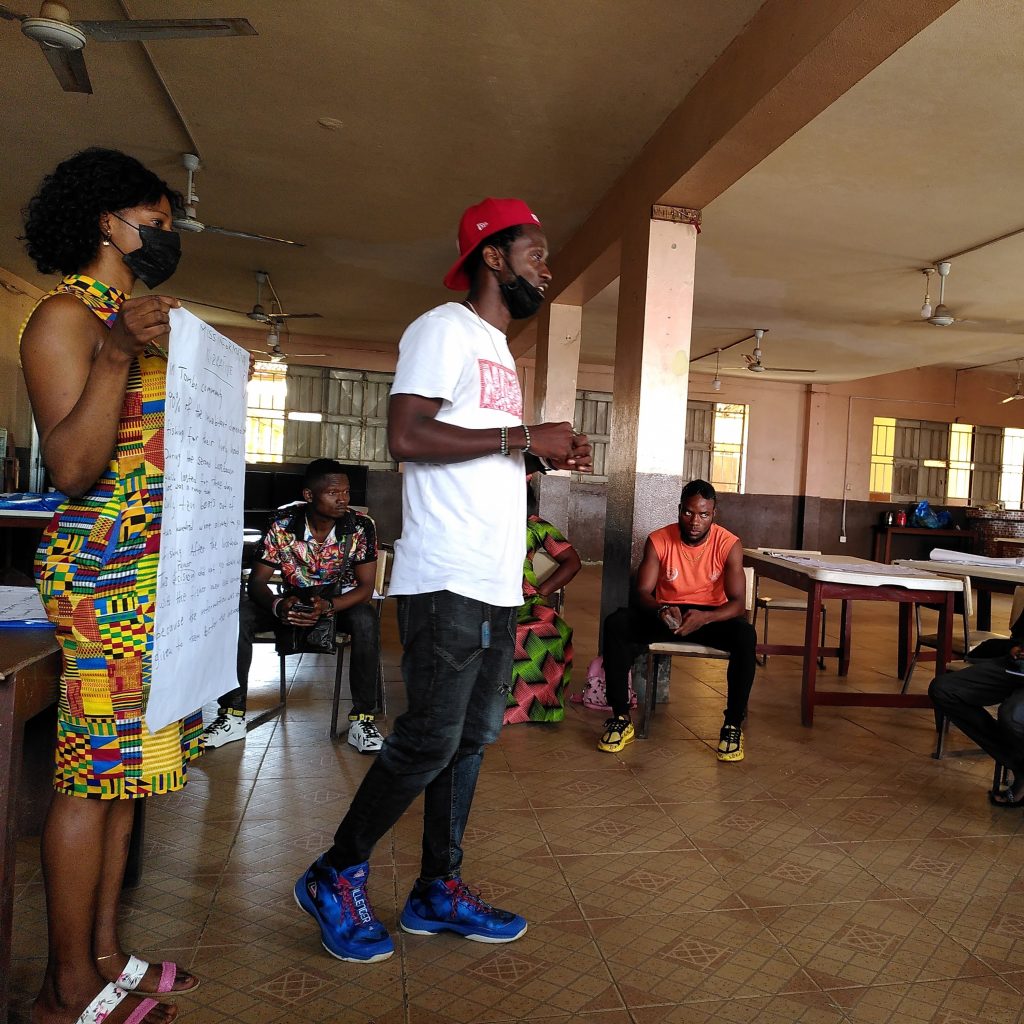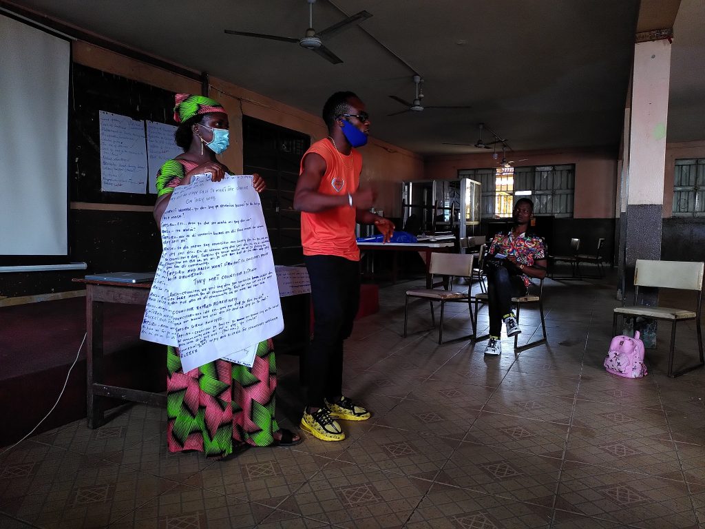 Auch ich hatte eine feste Rolle in unserem Programm. Ich habe immer ein bisschen vom globalen Klimawandel berichtet. Hier in Sierra Leone kam der Regen viel zu spät dieses Jahr und vor allem bis jetzt auch zu wenig. In Deutschland hingegen gab es zu viel Regen mit Flut und Todesopfern. Die Menschen fanden es sehr spannend etwas aus Deutschland zu erfahren. Vor allem hätten sie nicht gedacht, dass auch wir Probleme mit dem Klimawandel haben. Nach meiner kleinen Ansprache, gab es meist noch Zeit für Fragen. Die Leute waren sehr interessiert daran, wie bei uns der Wald aussieht, welche Tiere wir haben und ob man im Wald jagen darf. Es ist gar nicht so leicht, diese Fragen so zu beantworten, dass die Antworten verstanden werden, wenn die Menschen nur ihre eigene Umgebung kennen und keine Idee davon haben, wie in Deutschland Bäume, Tiere und Nutzpflanzen aussehen. Die Leute waren auch immer sehr überrascht, wenn ich gesagt habe, bei uns wachsen weder Bananen noch Mangos noch Papaya noch Ananas. Wahrscheinlich bemitleiden sie uns jetzt sehr.