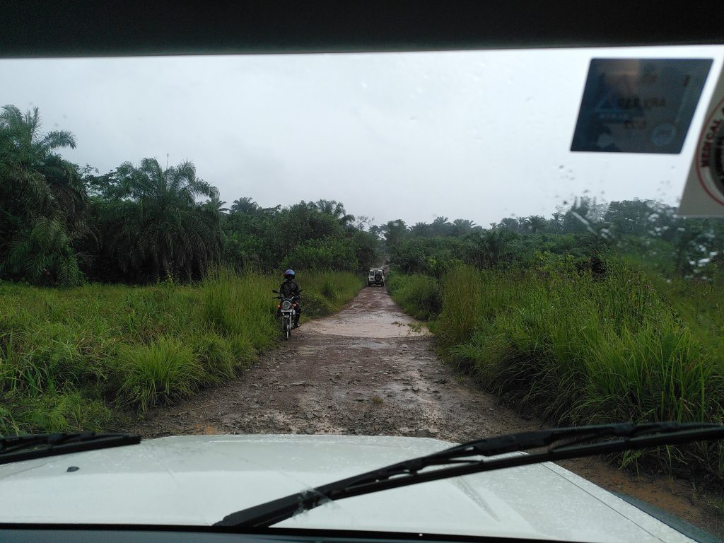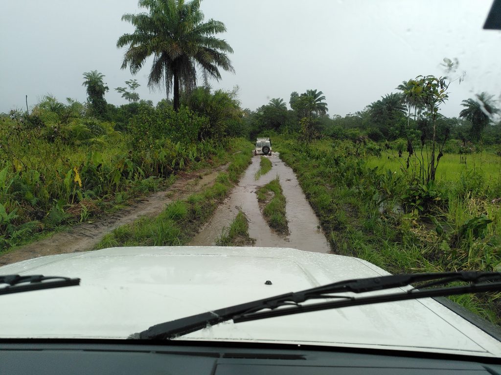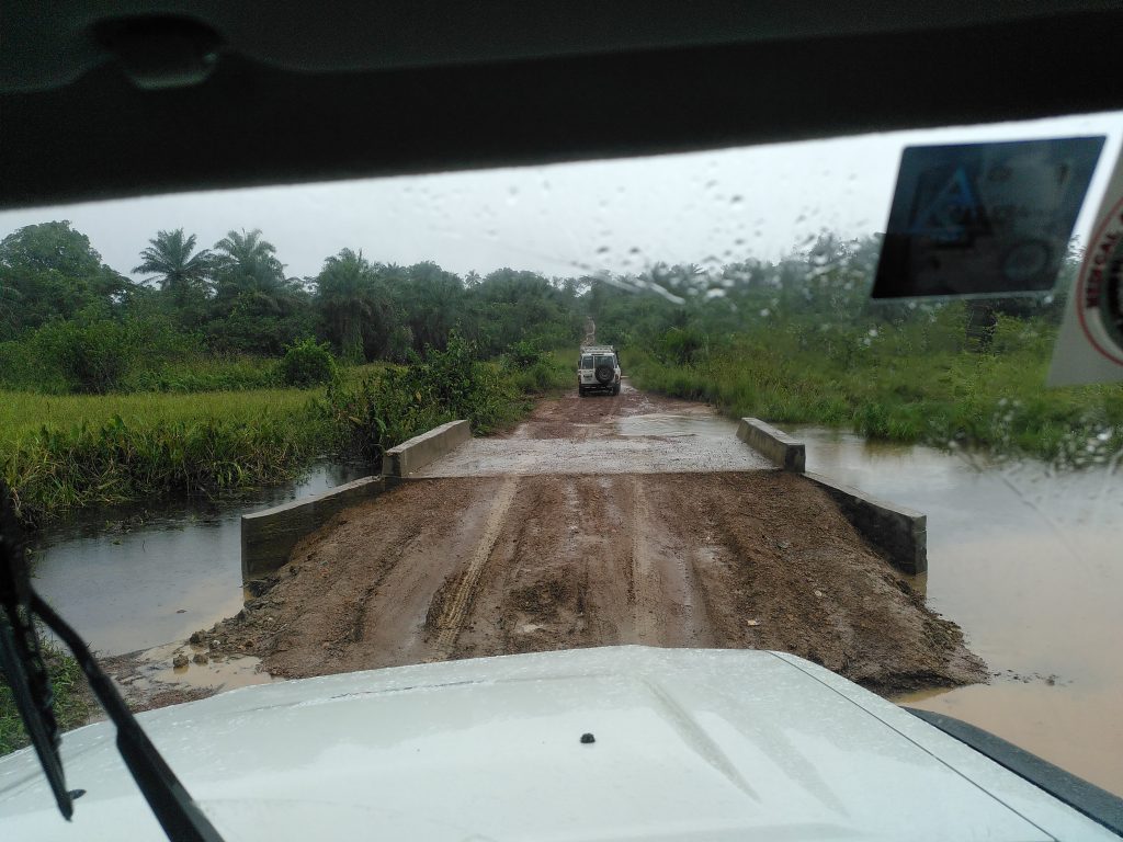 In sechs Tagen haben wir sechs Dörfer besucht. Teilweise haben wir in den Dörfern übernachtet, wenn der Weg zurück in die Stadt zu weit gewesen wäre. Mal wieder hat sich bestätigt, dass es mehr als sinnig ist, mit Landcruisern unterwegs zu sein. Nicht nur, dass der Regen die „Straßen“ teilweise in Bäche verwandelt hatte, hinzu kam noch, dass die Straßen an manchen Stellen aus so tiefen Furchen bestanden, dass selbst wir manchmal stecken blieben. Da viel zu schwere LKWs die vom Regen verschlammten Straßen benutzen, ist das Vorankommen echt eine Herausforderung und ich war sehr froh, dass ich dieses Mal nicht selbst gefahren bin. Einige Dörfer erreichten wir erst nach mehreren Stunden Fahrt, am Ende führte manchmal nur noch ein schmaler Weg dorthin, der eher für Motorräder als für Autos gedacht ist. Wir fuhren also mit zwei Rädern auf dem Weg und mit den anderen beiden Rädern im Gebüsch. Auf dem letzten Bild ist natürlich keine Straße zu sehen, sondern ein Fluß, den wir überquer haben 😉
