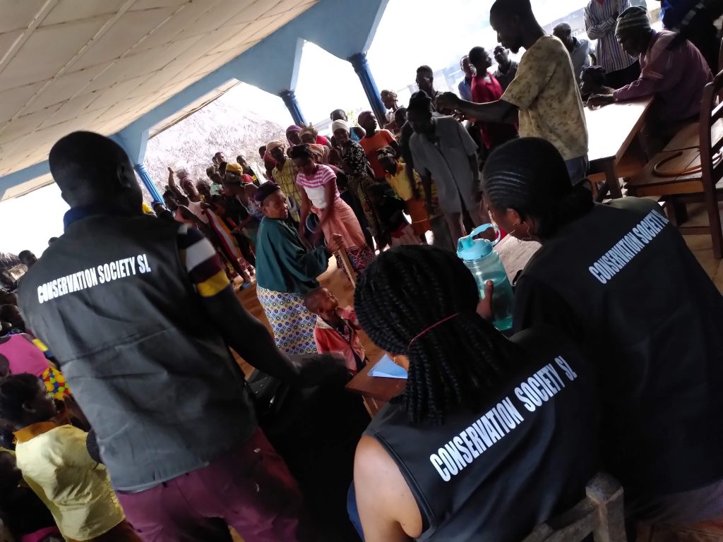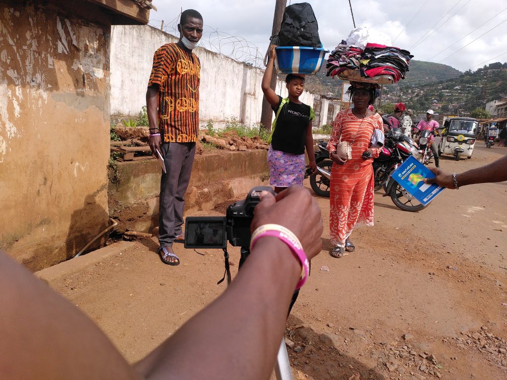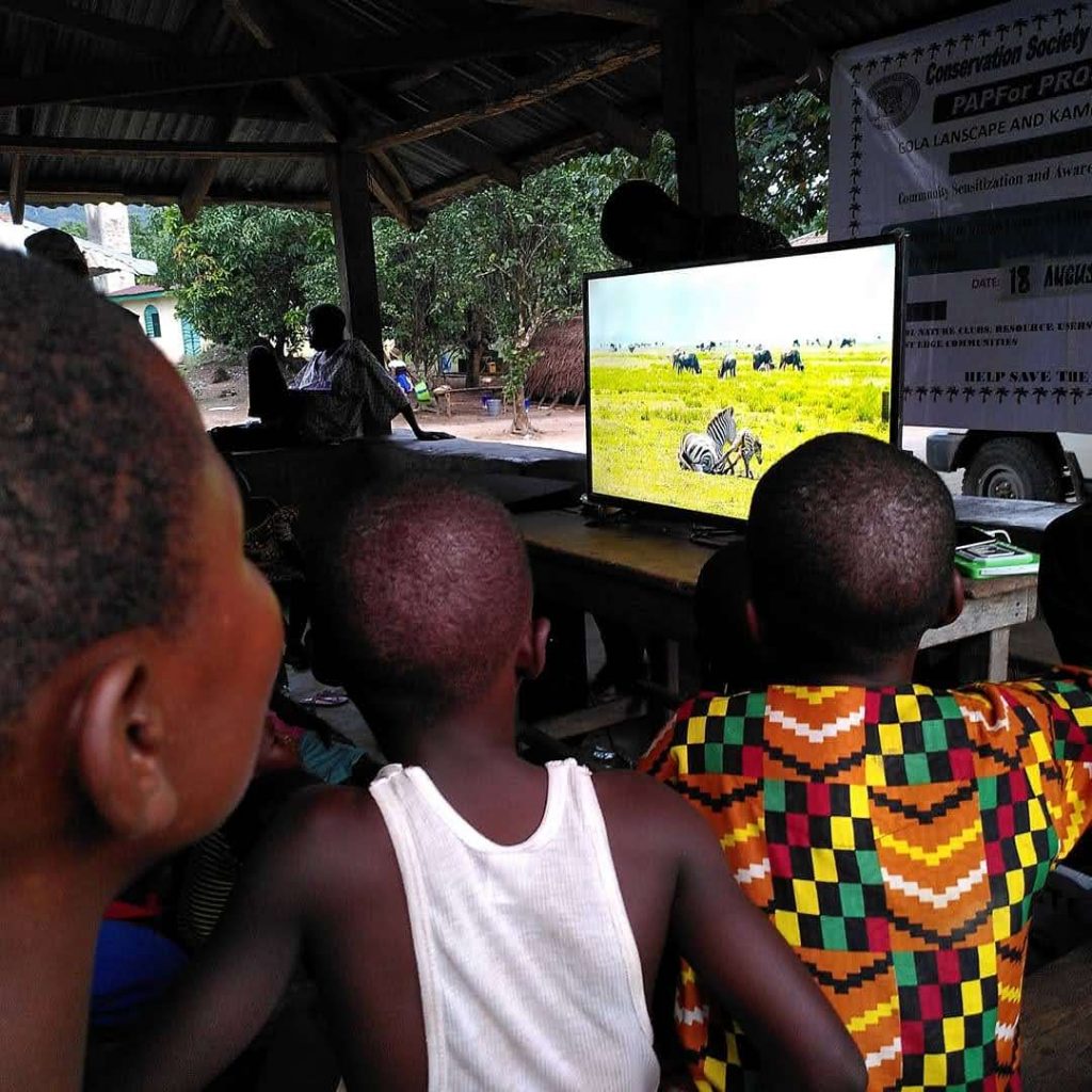 Nach den Kindern gab es noch ein Quiz für die Erwachsenen. Für die gab es als Preise natürlich keine Hefte und Stifte, sondern Zahncreme, Seifen und Sandalen. Teilweise ging es sehr emotional und engagiert zur Sache. Die Erwachsenen sollten das Wissen wiederholen, dass wir zuvor vermittelt hatten. Eine große Unterhaltungsshow für das ganze Dorf. Nach dem Quiz wurde der Fernseher angemacht und Naturdokumentationen und Dokumentationen zu den Themen Biodiversität und Conservation gezeigt. Das kam natürlich immer super an. Vor allem, da es in den meisten Dörfern keinen Fernseher gibt. Besonders die Reportage aus Freetown über den Landslide vor ein paar Jahren stieß immer auf großes Interesse und große emotionale Teilhabe. In der Nähe von Freetown gab es vor ein paar Jahren einen Erdrutsch an einem Hügel, an dem der Wald abgeholzt worden war und Menschen ihre Häuser gebaut haben. Viele kamen ums Leben. Einerseits haben einige wahrscheinlich das erste Mal Bilder ihrer eigenen Hauptstadt gesehen und dann ist es natürlich immer berührender, wenn ein Unglück in der direkten Umgebung passiert. Kennen wir ja alle.
