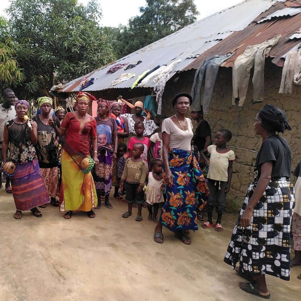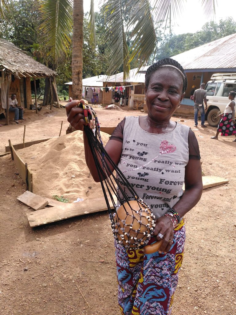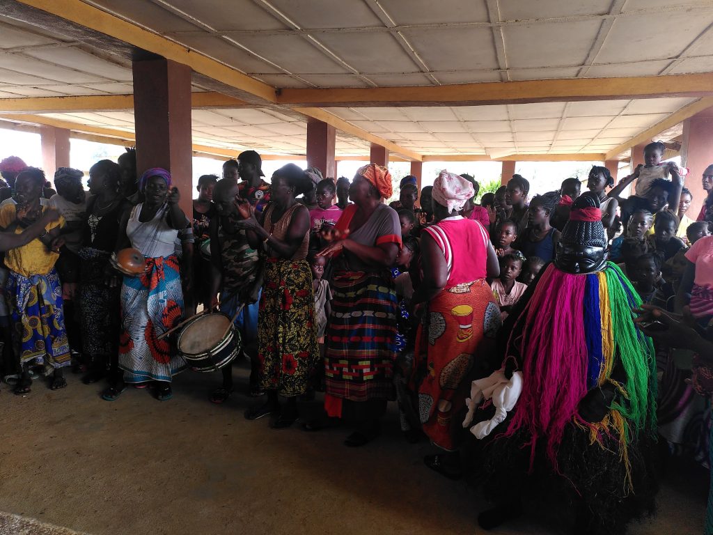 Meist ertönten dann schon die ersten Trommeln und Rasseln, die den Teufel ankündigen. In den meisten Dörfern haben uns Frauen aus der örtlichen Geheimgesellschaft mit Musik und Tanz begrüßt, unter ihnen immer eine als Teufel verkleidete Frau. In manchen Dörfern wurden wir zum Mittanzen aufgefordert. Der Teufel wurde von uns mit ein paar kleinen Geldscheinen bezahlt, um ihn zu besänftigen und damit wir dann irgendwann mit unserem Programm starten konnten.