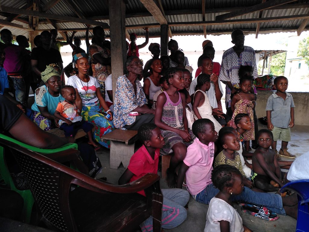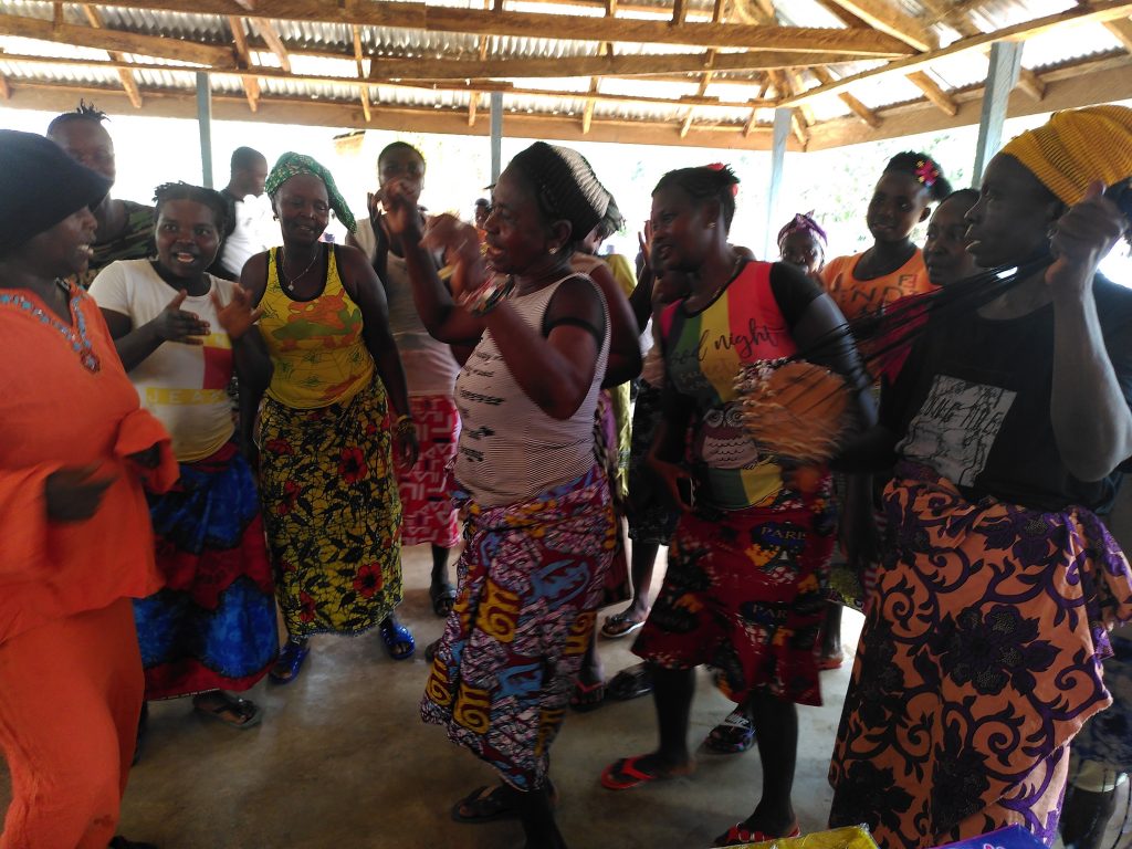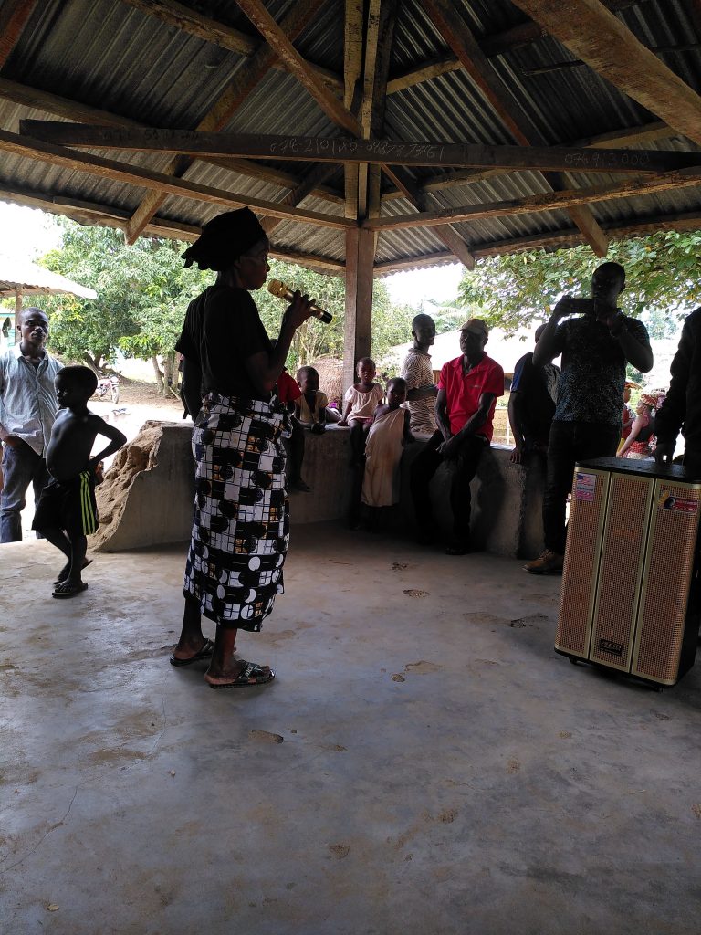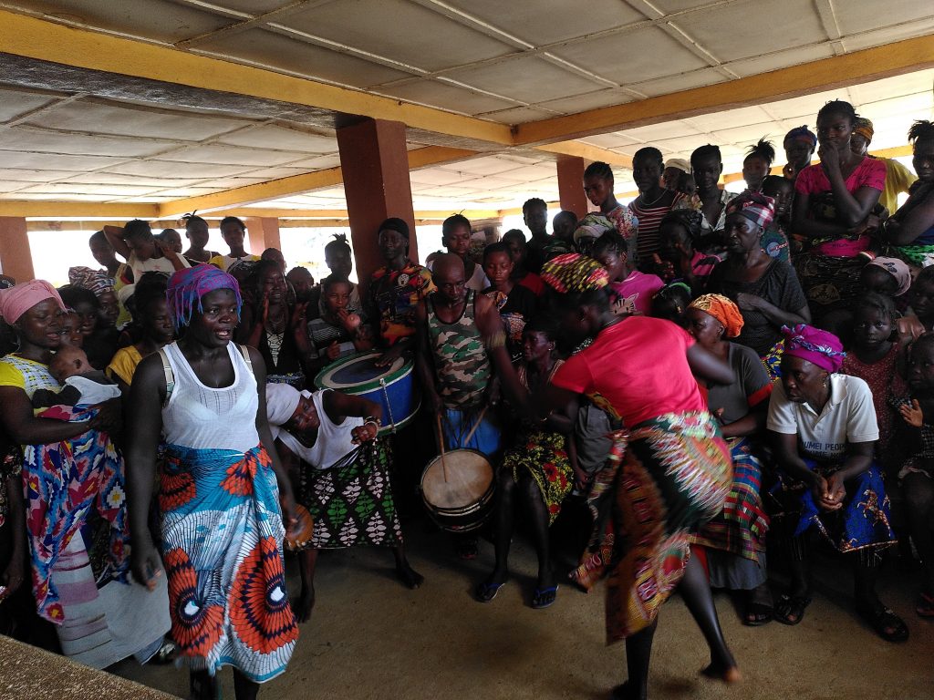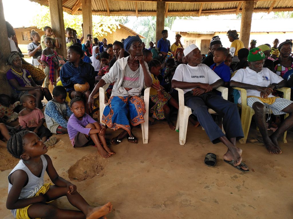 Während der Tanzsessions haben sich normalerweise immer mehr Bänke eingefunden, teilweise auf fleißigen Köpfen aus der lokalen Schule herbeigetragen oder aus verschiedenen Haushalten herbeigebracht. Klein und Groß, Jung und Alt haben sich nach und nach eingefunden, so dass mit der Begrüßung und der Vorstellung der wichtigsten Personen aus dem Dorf begonnen werden konnte. Nach diesem wichtigen Punkt, begannen unsere Reden. Ich habe nicht alles verstanden, da die Menschen in der Gegend Mende sprechen und ich außer ein paar Begrüßungsfloskeln nichts verstehe. Aber ich weiß natürlich, dass meine Kolleginnen und Kollegen in ihren Reden über die Bedeutung des Waldes gesprochen haben, über die benefits, die der Wald bietet, über die fünf Dinge, die man nicht im Naturschutzgebiet machen darf. Es wurde erklärt, welche Art von Fischerei möglich ist, wie die Pflanzen genutzt werden dürfen und was die Folgen vom Waldrückgang sein werden.