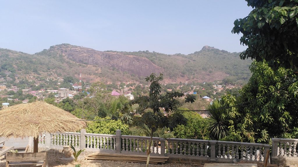 Nach fünfeinhalbstündiger Fahrt und einer „kurzen“ Mittagspause in Makeni sind wir am späten Nachmittag im Hill View Guesthouse angekommen. Unserer Unterkunft. Es ist sehr schön hergerichtet, mit fantastischem Blick auf die Wara-Wara Mountains. Wir haben uns sofort wohl gefühlt.